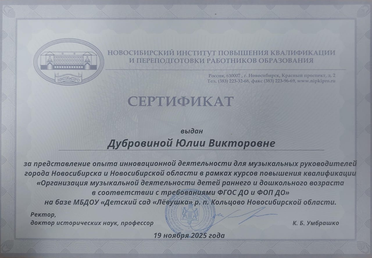 Сертификат НИПКиПРО от 20.11.24 за предоставление опыта инновационной деятельности в рамках курсов повышения квалификации