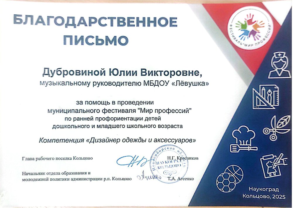 Благодарственное письмо главы раб. поселка Красникова Н.Г. " Мир профессий" 2026
