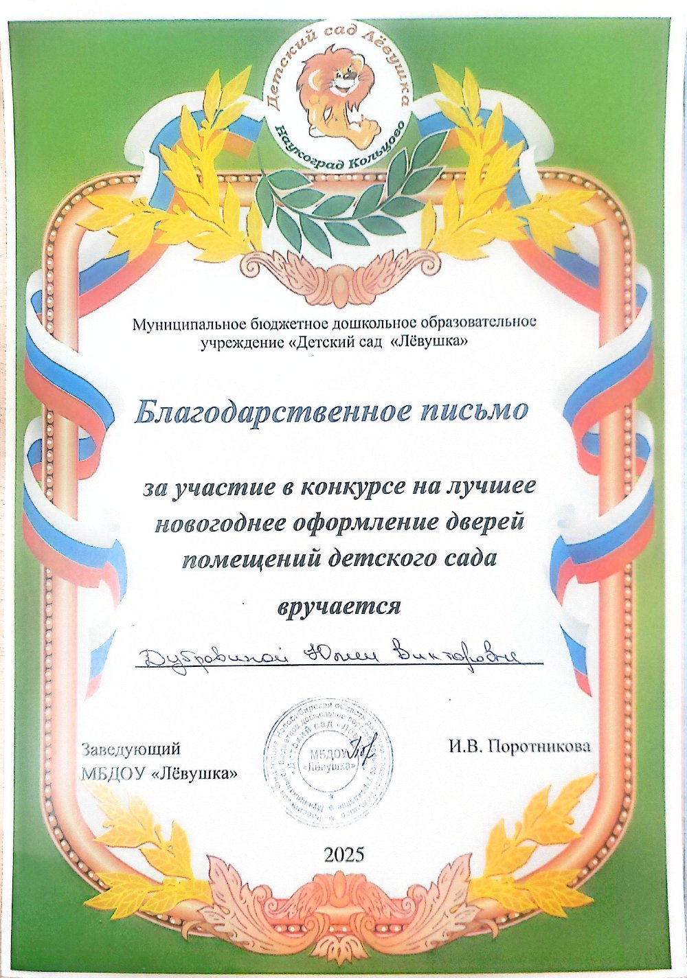 Благодарственное письмо МБДОУ Лёвушка "Конкурс лучшее новогоднее оформление дверей